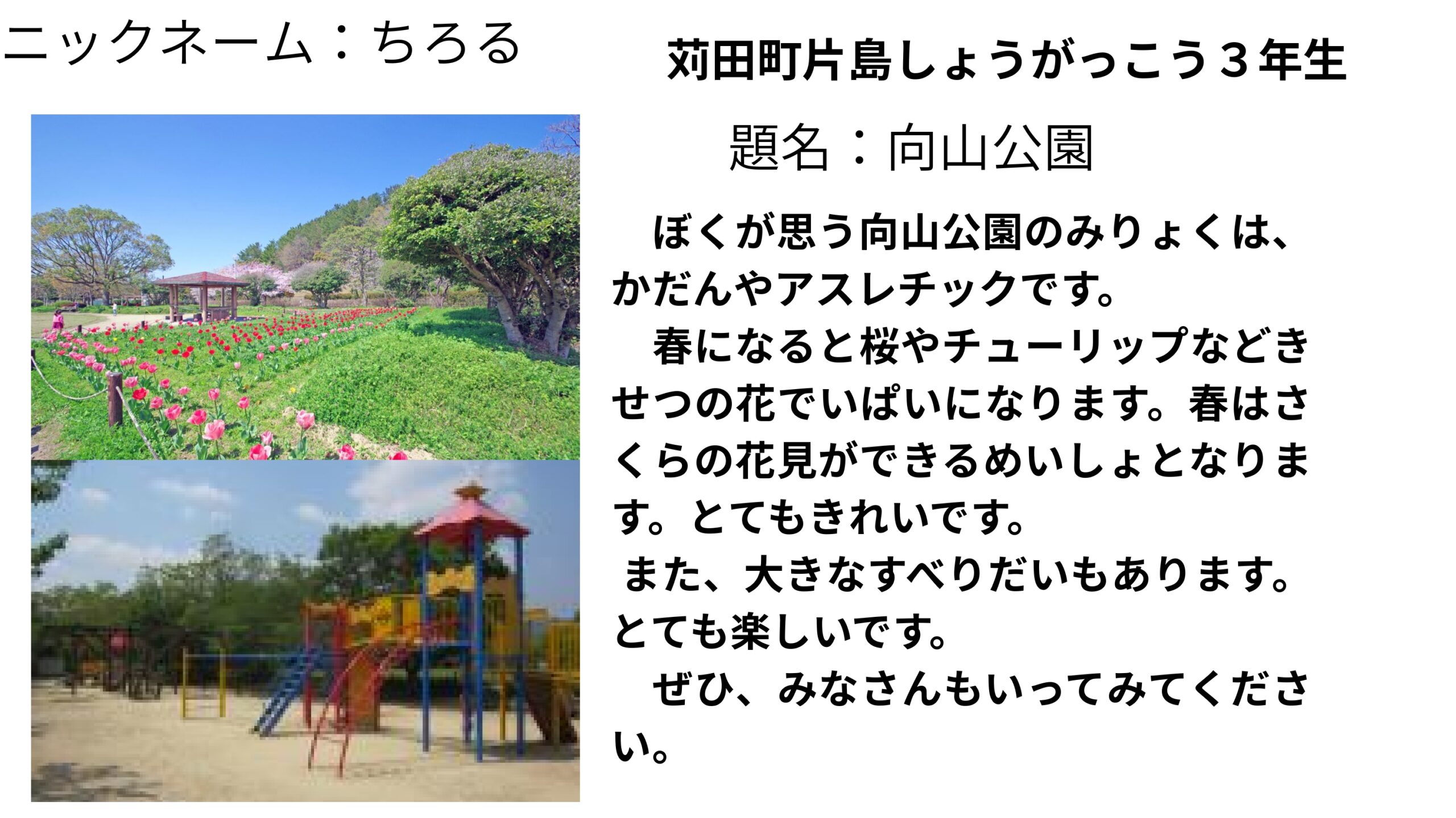 内容:ぼくが思う向山公園のみりょくは、かだんやアスレチックです。