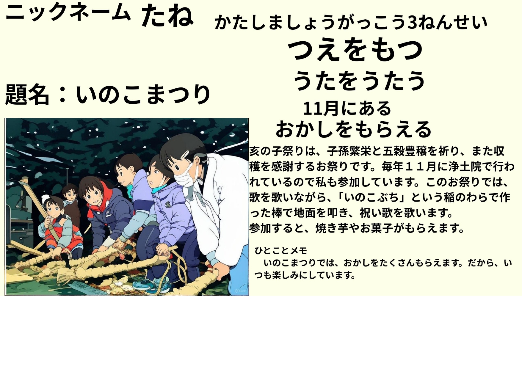 いのこまつりでは、おかしをたくさんもらえます。だから、いつも楽しみにしています。