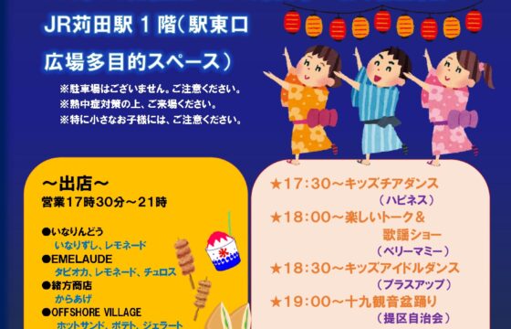 8月19日 十九観音盆踊り&夜の苅田えきらく大市 善立寺の観音様の御開帳にあわせ提区でおこなっている盆踊り大会です。 【主催】 堤区 自治会 【共催】 (一社)苅田まちづくり観光協会 (TEL:093-434-5560)(FAX:093-434-5561)