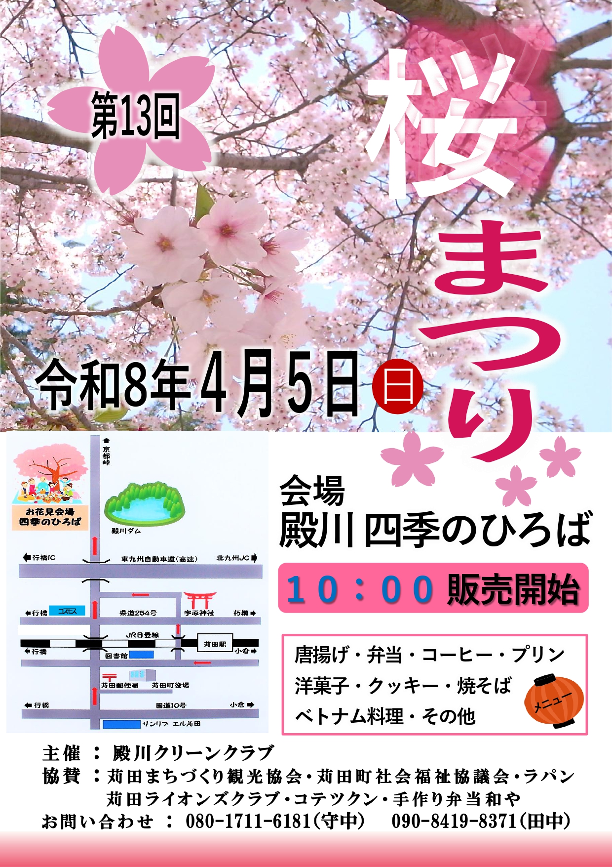 第13回 桜まつり 開催! 2026年4月5日 会場:殿川 四季のひろば 主催:殿川クリーンクラブ 協賛:苅田まちづくり観光協会・苅田町社会福祉協議会・ラパン・苅田ライオンズクラブ・コテツクン・手作り弁当和和や